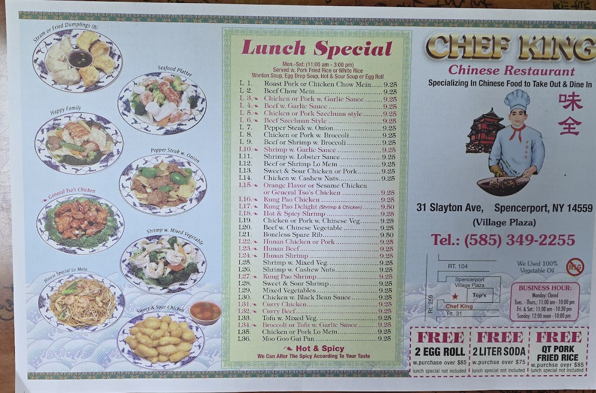 The menu at Chef King offers a delightful variety of Chinese-American dishes, ensuring there’s something for every palate. For those looking for a healthy yet flavorful option, the Broccoli dish stands out, perfectly cooked and seasoned to bring out the natural flavors of the vegetable. A satisfying choice for fans of hearty meals is the Fried Rice, a savory blend of rice, vegetables, and your choice of protein, cooked to perfection. Another highlight is the Vegetable Lo Mein, a delicious noodle dish loaded with fresh vegetables and tossed in a light sauce that keeps the flavors balanced. The diverse menu at Chef King guarantees a fulfilling dining experience, whether you’re craving something light or a more substantial dish. With its combination of traditional Chinese fare and welcoming atmosphere, Chef King has earned a well-deserved reputation in Spencerport.